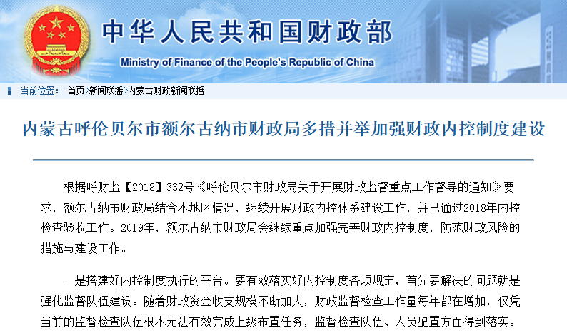 根據(jù)呼財(cái)監(jiān)【2018】332號《呼倫貝爾市財(cái)政局關(guān)于開展財(cái)政監(jiān)督重點(diǎn)工作督導(dǎo)的通知》要求,額爾古納市財(cái)政局結(jié)合本地區(qū)情況,繼續(xù)開展財(cái)政內(nèi)控體系建設(shè)工作,并已通過2018年內(nèi)控檢查驗(yàn)收工作。2019年,額爾古納市財(cái)政局會繼續(xù)重點(diǎn)加強(qiáng)完善財(cái)政內(nèi)控制度,防范財(cái)政風(fēng)險(xiǎn)的措施與建設(shè)工作。