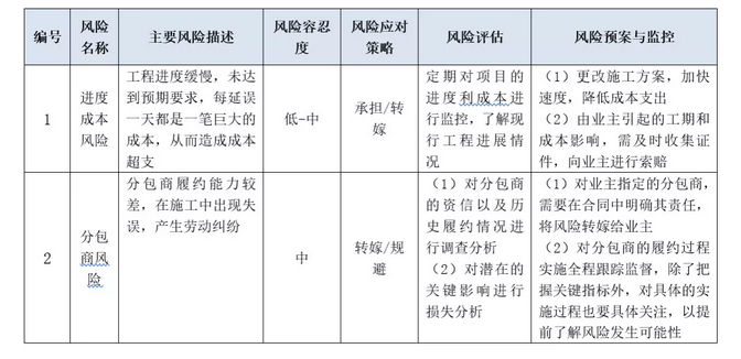 (4) 在風(fēng)險(xiǎn)應(yīng)對(duì)方面,針對(duì)識(shí)別出來(lái)的主要風(fēng)險(xiǎn)項(xiàng),逐項(xiàng)制定應(yīng)對(duì)策略