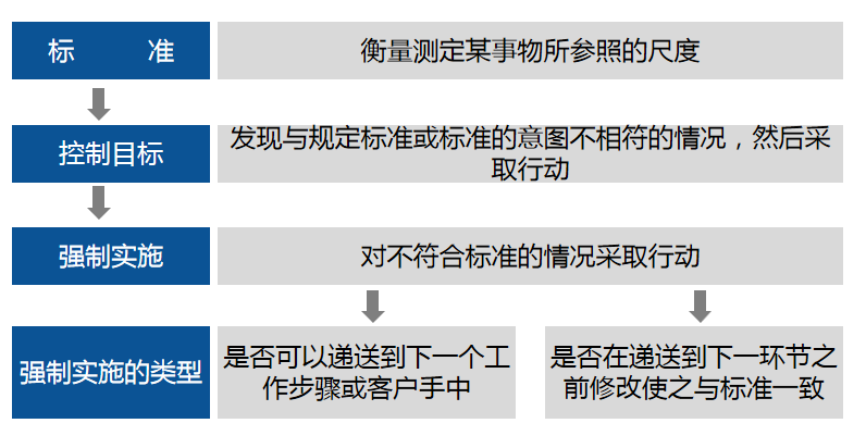 控制的目標(biāo)在于檢測(cè)不符合規(guī)定標(biāo)準(zhǔn)或與標(biāo)準(zhǔn)的意圖不一致的情況。內(nèi)部控制應(yīng)當(dāng)確定交付成果是否符合標(biāo)準(zhǔn)。而強(qiáng)制實(shí)施就是對(duì)不符合標(biāo)準(zhǔn)的情況采取糾正行動(dòng)的責(zé)任。管理層需要制定控制規(guī)則來(lái)判斷交付到下一個(gè)階段或客戶的交付產(chǎn)品是否符合標(biāo)準(zhǔn)的要求,以及不符合標(biāo)準(zhǔn)的交付產(chǎn)品經(jīng)過(guò)改進(jìn)措施是否可以重新達(dá)到交付的要求。