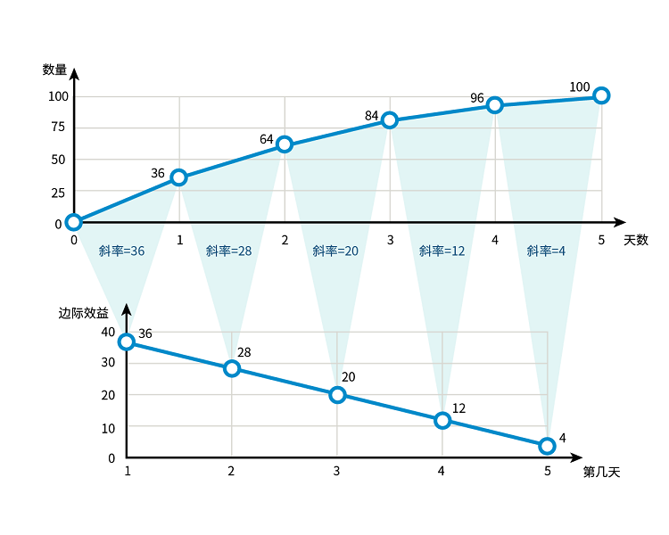 情況2:如果公司有另外一個(gè)產(chǎn)品B同樣在該地區(qū)的銷售,在同樣宣傳、銷售條件下,宣傳一天售出36件,宣傳二天售出64件,宣傳三天售出84件,宣傳4天售出96件,宣傳5天售出100件。產(chǎn)品B每一天的邊際收益:第一天36件,第二天28件,第三天20件,第四天12件,第五天4件。