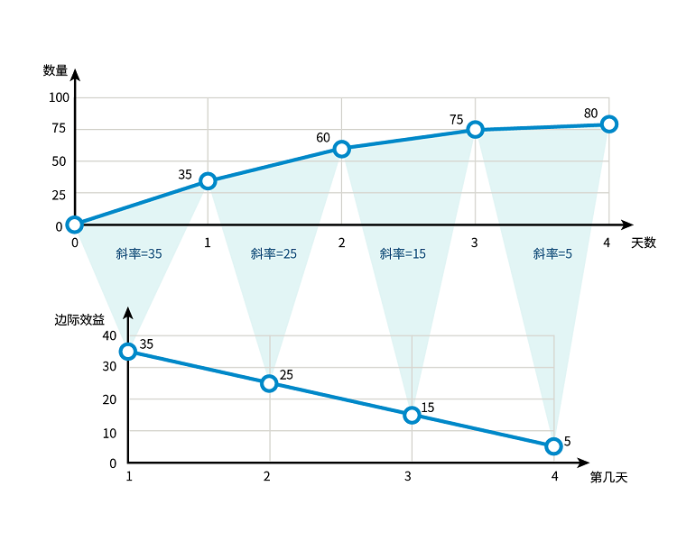 情況1:假設(shè)一個(gè)公司需要在特定的時(shí)間在某個(gè)地區(qū)銷售一定數(shù)量的產(chǎn)品A,宣傳一天的時(shí)間售出35件,如果宣傳二天售出60件,宣傳三天售出75件,宣傳4天售出80件。這個(gè)時(shí)候我們可以算出每一天的邊際效益、第一天35件,第二天25件,第三天15件,第四天5件。邊際效益隨著我們宣傳投入時(shí)間的增加而遞減。