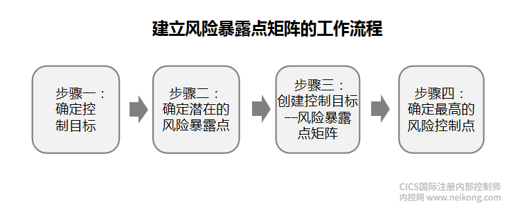建立和使用“控制目標(biāo)——風(fēng)險暴露點矩陣”的四個步驟如圖所示。該矩陣的方法可以應(yīng)用于內(nèi)控系統(tǒng)的項目小組、確認(rèn)控制措施實施情況的評價小組,或由審計人員用于評估內(nèi)部控制的適當(dāng)性。