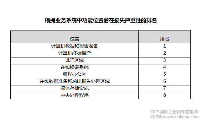 數(shù)據(jù)和報告準(zhǔn)備區(qū)域以及計算機運行設(shè)施——人們發(fā)現(xiàn)手動功能最集中的物理位置是最薄弱的位置。根據(jù)業(yè)務(wù)系統(tǒng)中功能位置潛在損失嚴(yán)重性的排名,下表描述并排序了8個主要風(fēng)險位置。