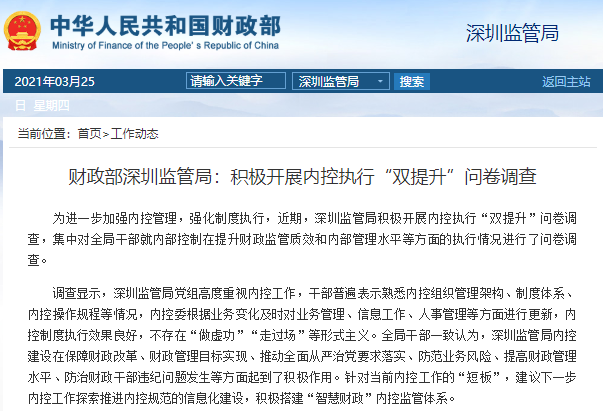 財政部深圳監(jiān)管局:積極開展內(nèi)控執(zhí)行“雙提升”問卷調(diào)查