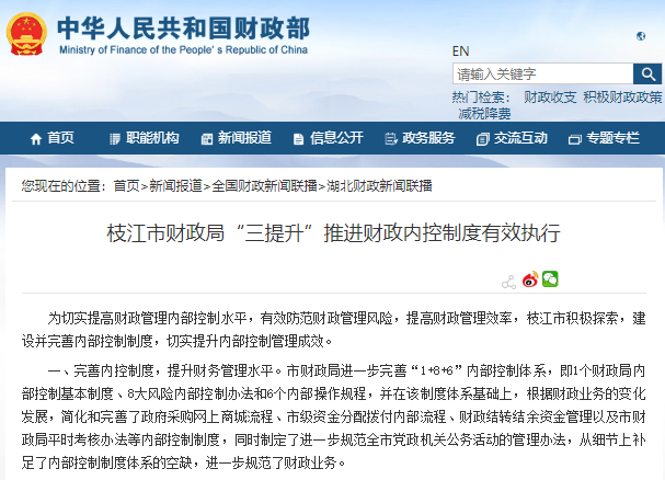 為切實提高財政管理內部控制水平,有效防范財政管理風險,提高財政管理效率,枝江市積極探索,建設并完善內部控制制度,切實提升內部控制管理成效。
