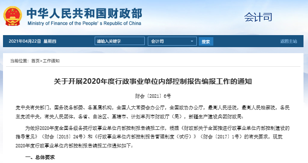 為做好2020年度全國各級各類行政事業(yè)單位內(nèi)部控制報告編報工作,根據(jù)《財政部關于全面推進行政事業(yè)單位內(nèi)部控制建設的指導意見》(財會〔2015〕24號)和《行政事業(yè)單位內(nèi)部控制報告管理制度(試行)》(財會〔2017〕1號)的有關要求,現(xiàn)就2020年度行政事業(yè)單位內(nèi)部控制報告編報工作通知如下:
