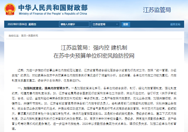 江蘇監(jiān)管局:強內(nèi)控?建機制??在蘇中央預算單位織密風險防控網(wǎng)