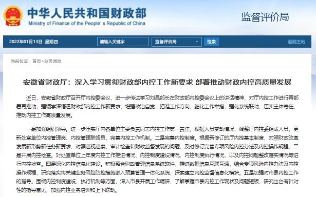 安徽省財(cái)政廳:深入學(xué)習(xí)貫徹財(cái)政部?jī)?nèi)控工作新要求?部署推動(dòng)財(cái)政內(nèi)控高質(zhì)量發(fā)展