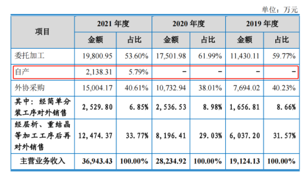 值得注意的是,昊帆生物主營業(yè)務收入根據(jù)生產(chǎn)模式劃分,委托加工和外協(xié)采購占比均較高引深交所問詢,公司自產(chǎn)產(chǎn)品收入占比較少。2019及2020年,昊帆生物均無來自自產(chǎn)產(chǎn)品的收入;2021年,公司自產(chǎn)產(chǎn)品的收入為2138.31萬元,占同期主營業(yè)務收入的比例為5.97%。
