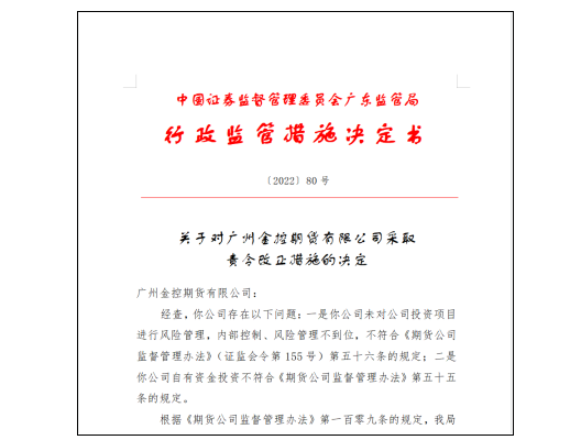 據(jù)決定書顯示,經(jīng)查,廣州金控期貨存在以下兩項問題:一是未對公司投資項目進行風(fēng)險管理,內(nèi)部控制、風(fēng)險管理不到位,不符合《期貨公司監(jiān)督管理辦法》(證監(jiān)會令第155號)第五十六條的規(guī)定;二是公司自有資金投資不符合《期貨公司監(jiān)督管理辦法》第五十五條的規(guī)定。