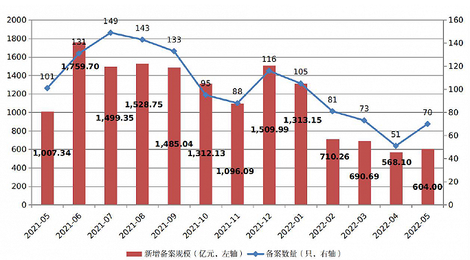 嚴(yán)監(jiān)管背景下,今年新增企業(yè)ABS規(guī)模猛降。中國(guó)基金業(yè)協(xié)會(huì)披露的數(shù)據(jù)顯示,2022年5月,企業(yè)資產(chǎn)證券化產(chǎn)品共備案確認(rèn)70只,新增備案規(guī)模合計(jì)604.00億元。5月新增備案規(guī)模環(huán)比增加6.32%,同比減少40.04%。