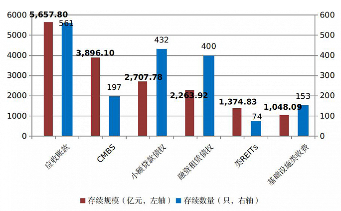 圖:存續(xù)企業(yè)資產(chǎn)證券化產(chǎn)品規(guī)模。來(lái)源:中國(guó)基金業(yè)協(xié)會(huì)