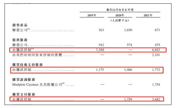 以2021年為例,思派健康向騰訊及其控制的子公司提供服務(wù)獲得684.3萬(wàn)元,此外,還包括177.2萬(wàn)元的購(gòu)買(mǎi)技術(shù)支持服務(wù)金額以及368.2萬(wàn)元的購(gòu)買(mǎi)支付服務(wù)金額。