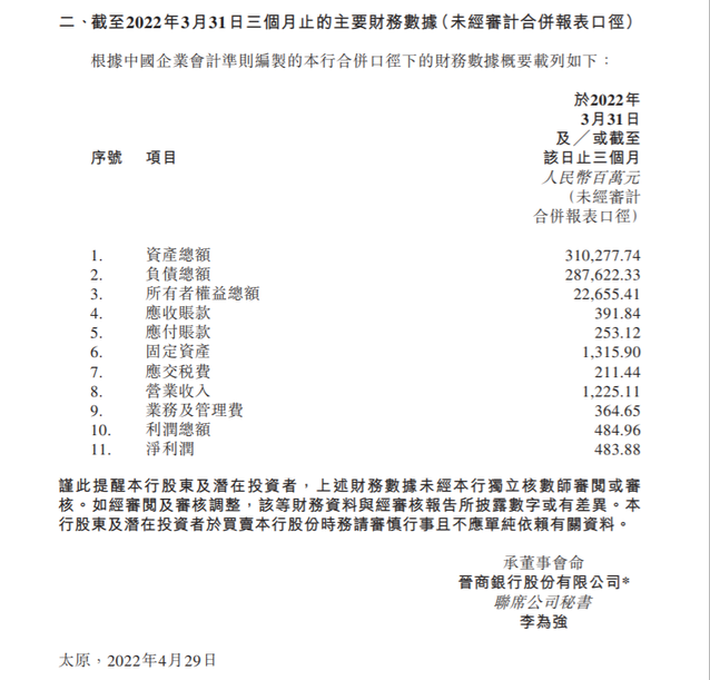 一季度報(bào)顯示,截至今年3月末,晉商銀行的資產(chǎn)總額為3102.78億元,負(fù)債總額為2876.22億元,所有者權(quán)益總額為226.55億元。