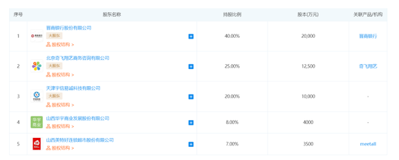 晉商消金的第一大股東是晉商銀行,持股40%;第二大股東是北京奇飛翔藝商務(wù)咨詢有限公司,持股25%;剩余三位股東為天津宇信易誠科技有限公司、山西華宇商業(yè)發(fā)展股份有限公司、山西美特好連鎖超市股份有限公司,分別持股20%、8%、7%。