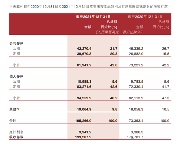 吸收存款增加主要是由于公司存款及個(gè)人存款規(guī)模均有所增加。截至2021年末,公司存款余額為819.41億元,較上一年末增加了87.2億元,同比增長了11.9%;個(gè)人存款余額為942.60億元,較上一年末增加了121.46億元,同比增長了14.8%。