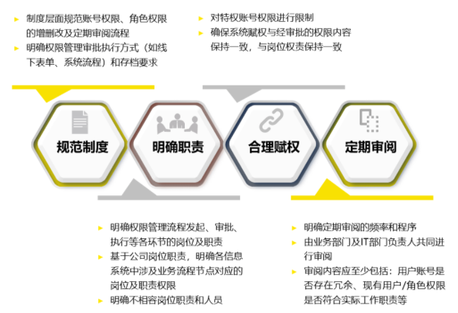 建議建設步驟為 “規(guī)范制度—明確職責—合理賦權—定期審閱”。通過建立權限矩陣、權限申請審批表、權限定期審閱表等控制性文檔,規(guī)范權限的新增、修改、刪除的審批流程,做到系統(tǒng)角色及功能分配合理化,并確保與授權審批機制核對一致,避免將不相容職責的處理權限授予同一用戶、超過用戶工作范圍賦予冗余權限、離職員工未及時中止系統(tǒng)權限等管理問題。