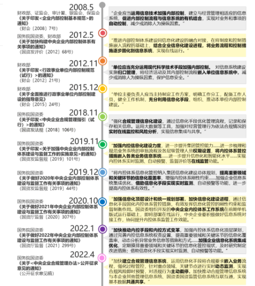 自2008年起,國務院國資委、財政部等監(jiān)管部門陸續(xù)出臺了一系列內(nèi)部控制管理相關政策規(guī)范,引導企業(yè)加強重視、有序開展內(nèi)控體系信息化建設工作。核心文件主要包括:
