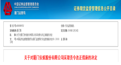 1月11日,廈門安妮股份(5.370,?-0.13,?-2.36%)有限公司因內(nèi)部控制存在較大缺陷等違規(guī)行為,被廈門證監(jiān)局采取責(zé)令改正行政監(jiān)管措施。
