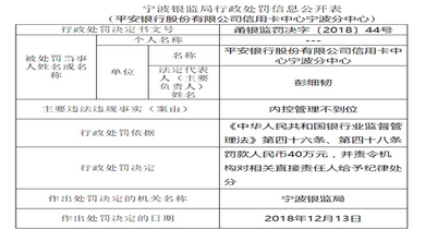 平安銀行信用卡寧波分中心被罰40萬:內(nèi)控管理不到位