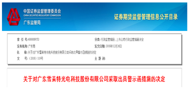 12月27日,廣東雪萊特光電科技股份有限公司因信息披露、公司治理與內(nèi)部控制方面的違規(guī)行為,公司及董事長,總裁兼財務(wù)負責(zé)人和董事會秘書一同被采取出具警示函的行政監(jiān)管措施。