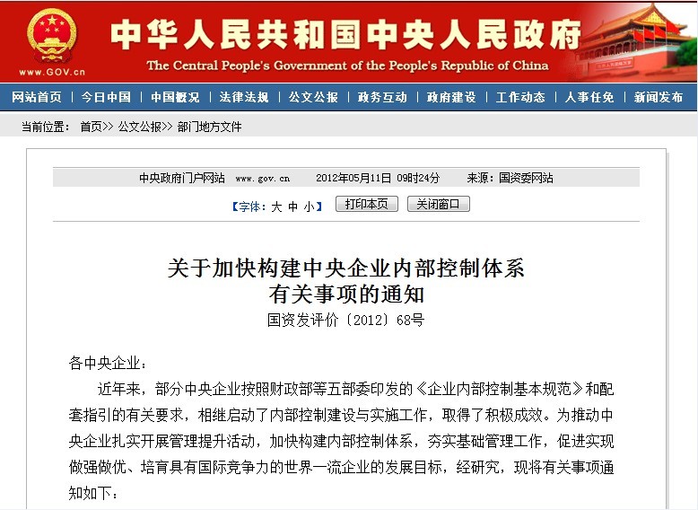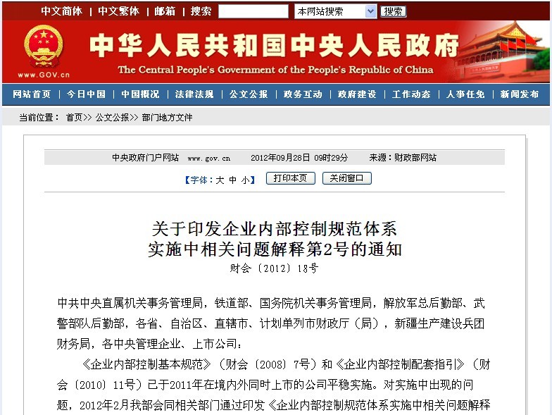 2008年5月財(cái)政部等五部委聯(lián)合發(fā)布了《企業(yè)內(nèi)部控制基本規(guī)范》就加強(qiáng)企業(yè)內(nèi)部控制、貫徹實(shí)施內(nèi)部控制規(guī)范作出了明確部署。2010年4月五部委又聯(lián)合發(fā)布了《企業(yè)內(nèi)部控制配套指引》,連同此前發(fā)布的《企業(yè)內(nèi)部控制基本規(guī)范》,標(biāo)志著中國(guó)企業(yè)內(nèi)部控制規(guī)范體系基本建成。2012年5月財(cái)政部聯(lián)合國(guó)資委下發(fā)《關(guān)于加快構(gòu)建中央企業(yè)內(nèi)部控制體系有關(guān)事項(xiàng)的通知》要求各中央企業(yè)全面啟動(dòng)內(nèi)部控制建設(shè)與實(shí)施工作。2012年8月財(cái)政部聯(lián)合證監(jiān)會(huì)發(fā)布《關(guān)于2012年主板上市公司分類分批實(shí)施企業(yè)內(nèi)部控制基本規(guī)范體系的通知》要求主板上市公司確保內(nèi)部控制體系建設(shè)落到實(shí)處。2012年11月財(cái)政部發(fā)布了《行政事業(yè)單位內(nèi)部控制規(guī)范(試行)》文件的通知,加強(qiáng)行政事業(yè)單位內(nèi)部控制規(guī)范并規(guī)定于2014年1月1日 起在全國(guó)范圍施行。……