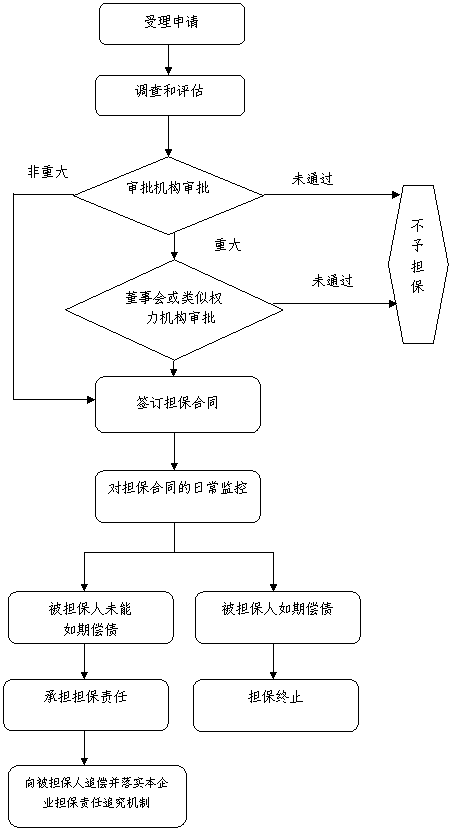 企業(yè)辦理?yè)?dān)保業(yè)務(wù),一般包括受理申請(qǐng)、調(diào)查評(píng)估、審批、簽訂擔(dān)保合同、進(jìn)行日常監(jiān)控等流程。具體而言,一是擔(dān)保申請(qǐng)人提出擔(dān)保申請(qǐng);二是擔(dān)保人對(duì)擔(dān)保項(xiàng)目和被擔(dān)保人資信狀況進(jìn)行調(diào)查,對(duì)擔(dān)保業(yè)務(wù)進(jìn)行風(fēng)險(xiǎn)評(píng)估;三是擔(dān)保人根據(jù)調(diào)查評(píng)估結(jié)果,結(jié)合本企業(yè)擔(dān)保政策和授權(quán)審批制度,對(duì)擔(dān)保業(yè)務(wù)進(jìn)行審批,重大擔(dān)保業(yè)務(wù)應(yīng)提交董事會(huì)或類似權(quán)力機(jī)構(gòu)批準(zhǔn);四是擔(dān)保人依據(jù)既定權(quán)限和程序,與被擔(dān)保人簽訂擔(dān)保合同;五是擔(dān)保人切實(shí)加強(qiáng)對(duì)擔(dān)保合同的日常管理,對(duì)被擔(dān)保人經(jīng)營(yíng)情況、財(cái)務(wù)狀況和擔(dān)保項(xiàng)目執(zhí)行情況等進(jìn)行跟蹤監(jiān)控;六是如果被擔(dān)保人不能如期償債,擔(dān)保人應(yīng)履行代為清償義務(wù)并向被擔(dān)保人追償債務(wù);同時(shí),應(yīng)當(dāng)按照本企業(yè)擔(dān)保業(yè)務(wù)責(zé)任追究制度,嚴(yán)格追究有關(guān)人員的責(zé)任。具體流程如下圖所示,該圖列示的擔(dān)保流程適用于各類企業(yè)的一般擔(dān)保業(yè)務(wù),具有通用性。企業(yè)在開(kāi)展擔(dān)保業(yè)務(wù)時(shí),可以參照此流程并結(jié)合自身情況予以擴(kuò)充和細(xì)化。