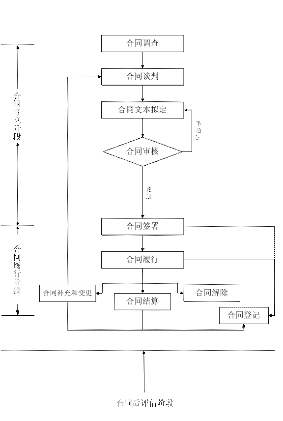 合同管理從大的方面可以劃分為合同訂立階段和合同履行階段。合同訂立階段包括合同調查、合同談判、合同文本擬定、合同審批、合同簽署等環(huán)節(jié);合同履行階段涉及合同履行、合同補充和變更、合同解除、合同結算、合同登記等環(huán)節(jié)。下圖列示的合同管理流程具有一定通用性。