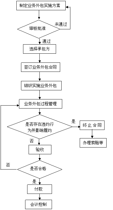 業(yè)務(wù)外包流程主要包括:制定業(yè)務(wù)外包實(shí)施方案、審核批準(zhǔn)、選擇承包方、簽訂業(yè)務(wù)外包合同、組織實(shí)施業(yè)務(wù)外包活動(dòng)、業(yè)務(wù)外包過程管理、驗(yàn)收、會(huì)計(jì)控制等環(huán)節(jié)。如下圖所示。該圖列示的業(yè)務(wù)外包流程適用于各類企業(yè)的一般業(yè)務(wù)外包,具有通用性。企業(yè)在實(shí)際開展業(yè)務(wù)外包時(shí),可以參照此流程,并結(jié)合自身情況予以擴(kuò)充和具體化。