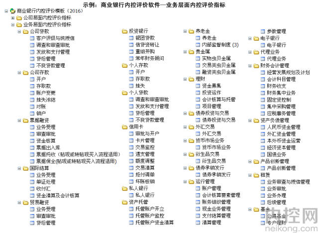 在流程層面的流程層面的內(nèi)部控制指標(biāo)包括銀行類和非銀行類業(yè)務(wù)的8條業(yè)務(wù)線,主要是指公司業(yè)務(wù)、投行業(yè)務(wù)、零售業(yè)務(wù)、資產(chǎn)管理、資金業(yè)務(wù)、支付與結(jié)算、中間業(yè)務(wù)以及其他銀行類業(yè)務(wù);內(nèi)容還包括基金、租賃等非銀行類業(yè)務(wù)。