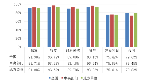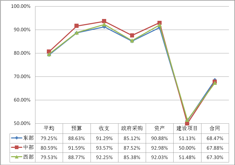 第三,制度體系初步建立。一是完成了重要領(lǐng)域流程再造。中央部門和地方單位對重大風險領(lǐng)域完成了流程再造,通過管理流程再造,重大風險管控率分別為53.23%、40.69%,各單位風險防范能力明顯增強。二是建立了六大業(yè)務內(nèi)部控制制度體系。從全國范圍來看,各單位建立基本涵蓋六大業(yè)務的內(nèi)部控制制度體系的比率為87.28%(從高到低分別為:收支管理93.72%、資產(chǎn)管理93.13%、預算管理91.90%、政府采購管理89.88%、合同管理79.63%、建設項目管理75.42%,見圖3),編制內(nèi)部控制業(yè)務流程圖的單位占比為67.80%,切實扎牢制度的“籠子”。三是各區(qū)域內(nèi)部控制制度同步推進。東部、中部、西部區(qū)域各單位內(nèi)部控制制度建立完成比率分別為79.25%、80.59%、79.53%(見圖4),充分說明不同地區(qū)各單位內(nèi)部控制建設實現(xiàn)同步推進。