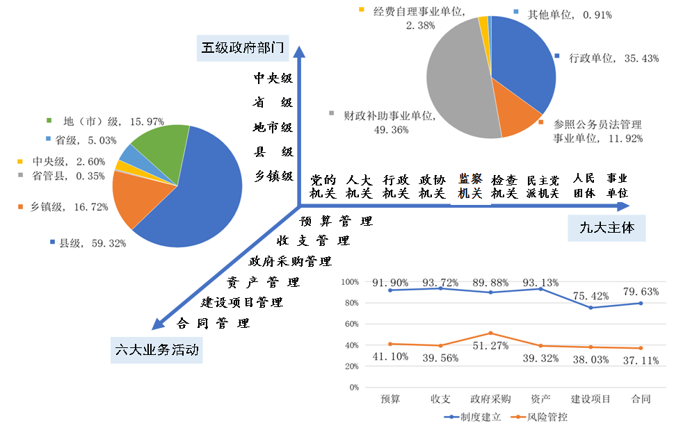 第一,工作格局初步形成。一是內(nèi)部控制制度體系基本建立。財政部初步搭建了包括《行政事業(yè)單位內(nèi)部控制規(guī)范(試行)》、《財政部關(guān)于全面推進行政事業(yè)單位內(nèi)部控制建設的指導意見》、《行政事業(yè)單位內(nèi)部控制報告管理制度(試行)》等制度在內(nèi)的“四梁八柱”單位內(nèi)部控制制度體系。二是全面覆蓋五級政府部門。納入預算管理的五級政府部門均完成了內(nèi)部控制建設部署工作,內(nèi)部控制建設已覆蓋到了從中央到鄉(xiāng)鎮(zhèn)的全部層級政府部門。三是全面覆蓋九類行政事業(yè)單位。全國九類不同性質(zhì)的行政事業(yè)單位均開展了內(nèi)部控制建設,包括黨的機關(guān)、人大機關(guān)、行政機關(guān)、政協(xié)機關(guān)、審判機關(guān)、檢察機關(guān)、各民主黨派機關(guān)、人民團體和事業(yè)單位。四是全面覆蓋六大業(yè)務。全國各單位的內(nèi)部控制管控領(lǐng)域基本覆蓋了單位層面和業(yè)務層面,部分單位還在《行政事業(yè)單位內(nèi)部控制規(guī)范(試行)》要求的基礎(chǔ)上,突出行業(yè)、部門特色拓展了內(nèi)部控制管控的業(yè)務范圍。(單位內(nèi)部控制建設覆蓋五級政府部門、六大業(yè)務活動及九大主體情況詳見圖1)