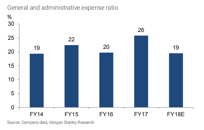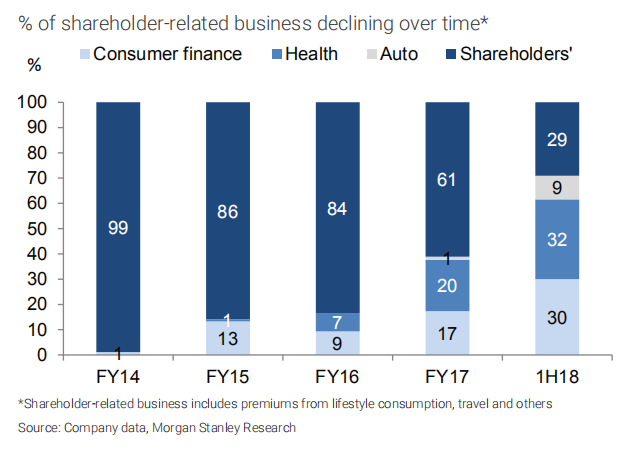 不再過度依賴主要股東后,眾安給股東們的提成比例在逐年下降,由2016年的41%下降到2018年的37%。大摩預(yù)計,2020年將下降到26%,下降幅度達(dá)11%。