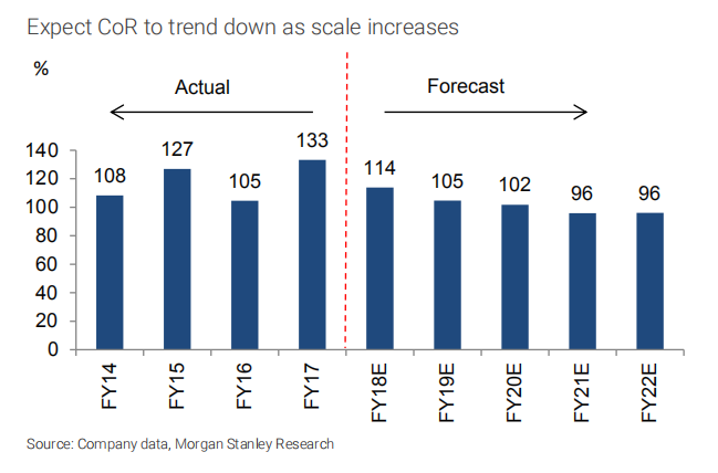 前不久,大投摩根發(fā)布了一份包括眾安保險業(yè)務(wù)成本分析數(shù)據(jù)在內(nèi)的研報。研報顯示,從2017年至2018年,眾安保險的業(yè)務(wù)成本從133%下降到114%,不僅如此,大摩還預(yù)測,眾安保險業(yè)務(wù)成本將會逐年下降,其原由何在?