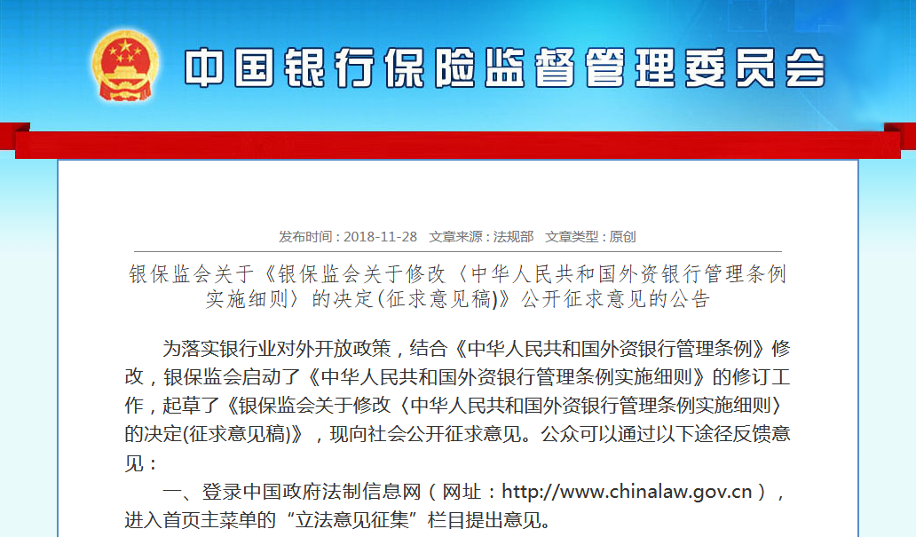 銀保監(jiān)會(huì)關(guān)于修改《中華人民共和國(guó)外資銀行管理?xiàng)l例實(shí)施細(xì)則》的決定(征求意見稿)