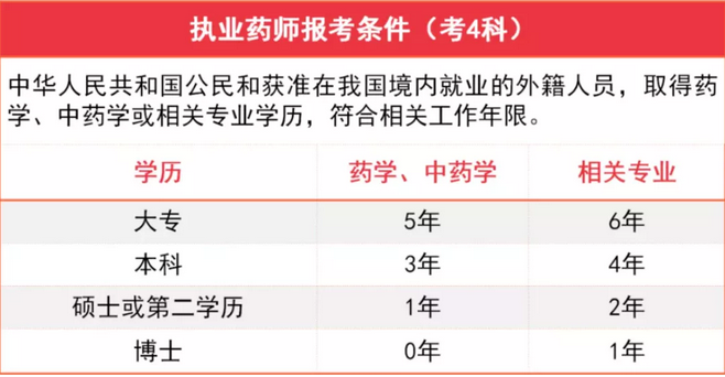自2021年起,中專學(xué)歷不再符合《執(zhí)業(yè)藥師職業(yè)資格制度規(guī)定》報(bào)考條件,也就不能按免考兩科的方式申請(qǐng)參加執(zhí)業(yè)藥師職業(yè)資格考試。執(zhí)業(yè)藥師考試所要求學(xué)歷為大專及以上學(xué)歷,不同學(xué)歷所要求的具體工作年限如下圖所示: