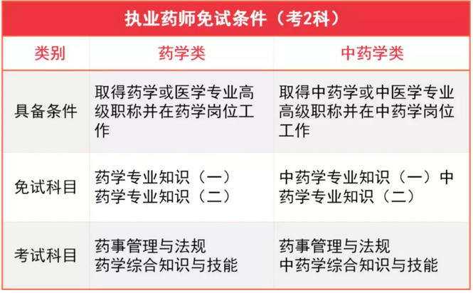 根據(jù)《考試辦法》第四條,符合《制度規(guī)定》報(bào)考條件,按照國(guó)家有關(guān)規(guī)定,取得藥學(xué)/中藥學(xué)或醫(yī)學(xué)/中醫(yī)學(xué)專業(yè)高級(jí)職稱并在藥學(xué)崗位工作的,可免試2科,具體規(guī)定如下: