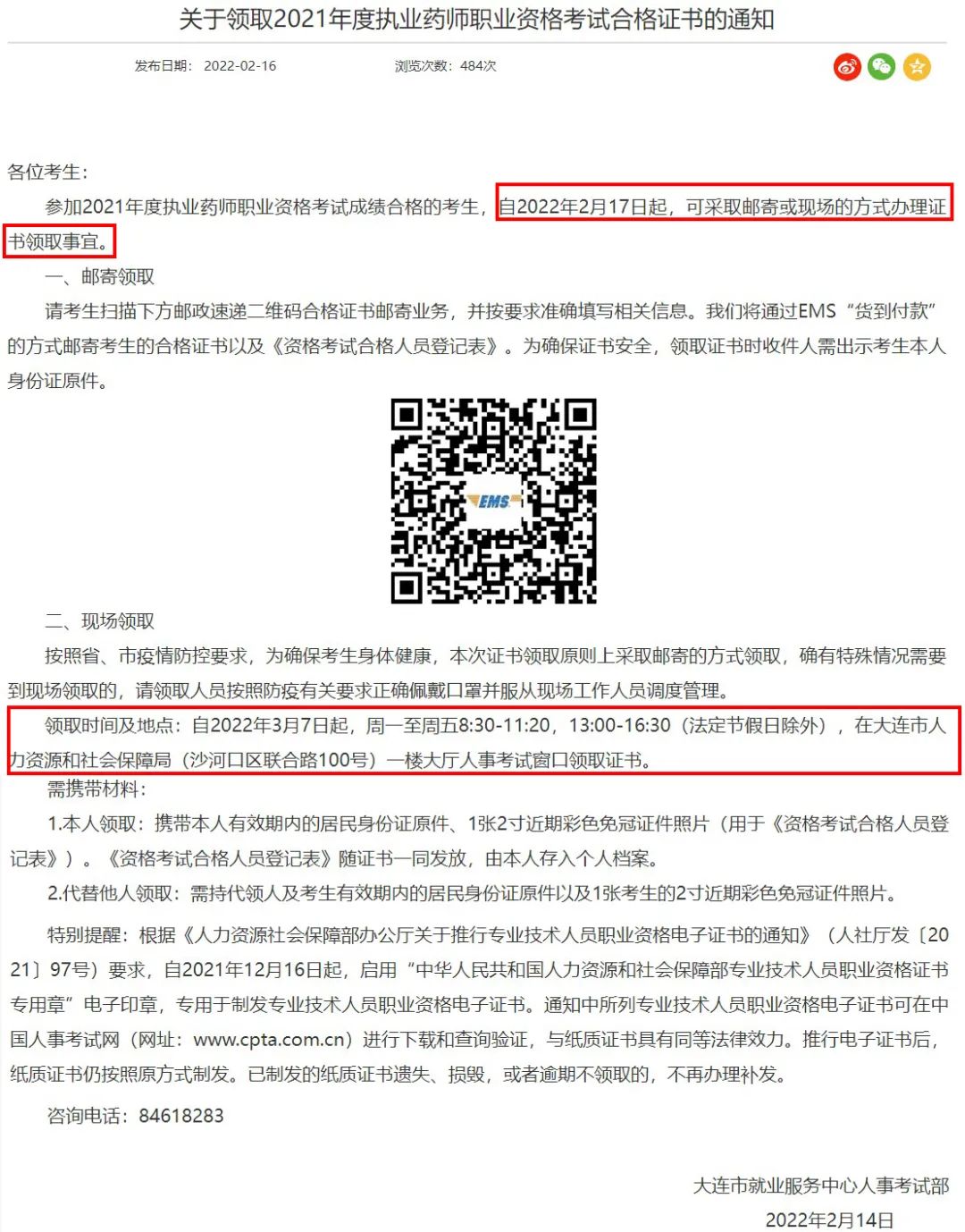 二、現(xiàn)場領取時間及地點:自2022年3月7日起,周一至周五8:30-11:20,13:00-16:30(法定節(jié)假日除外),在大連市人力資源和社會保障局(沙河口區(qū)聯(lián)合路100號)一樓大廳人事考試窗口領取證書。
