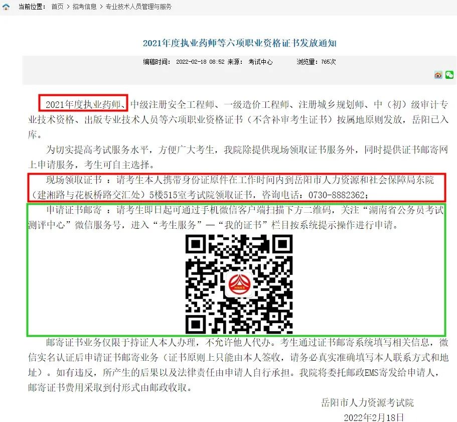 一、現(xiàn)場領取證書 :請考生本人攜帶身份證原件在工作時間內(nèi)到岳陽市人力資源和社會保障局東院(建湘路與花板橋路交匯處)5樓515室考試院領取證書。
