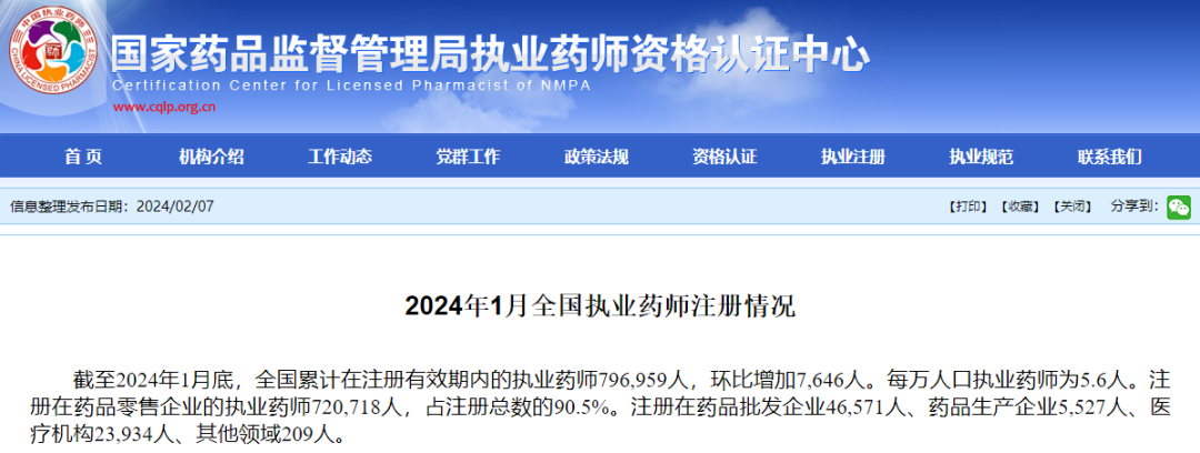 截至2024年1月底,全國累計在注冊有效期內(nèi)的執(zhí)業(yè)藥師796,959人,環(huán)比增加7,646人。