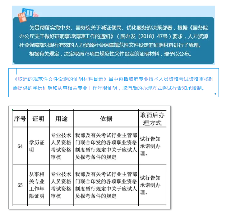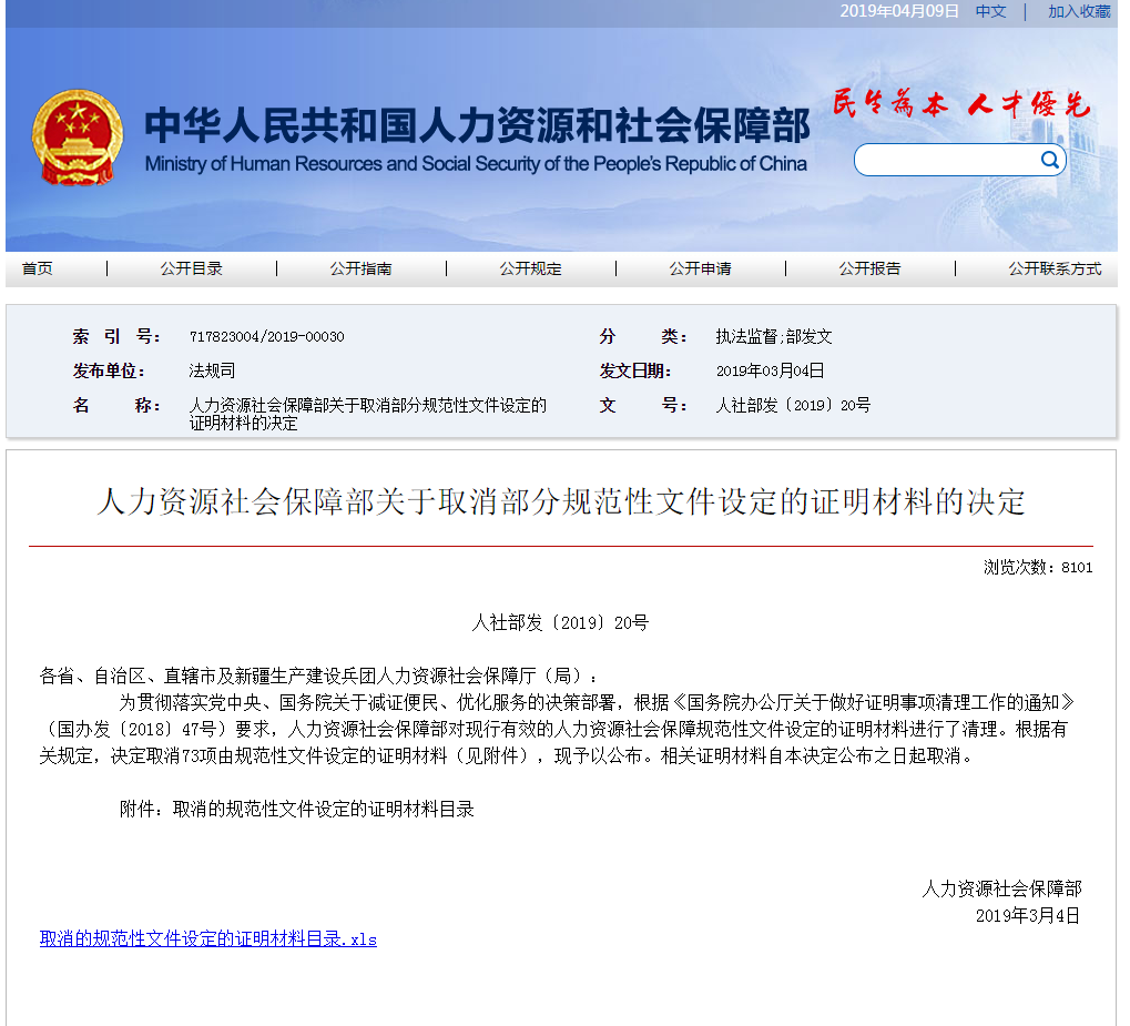 為貫徹落實(shí)黨中央、國務(wù)院關(guān)于減證便民、優(yōu)化服務(wù)的決策部署,根據(jù)《國務(wù)院辦公廳關(guān)于做好證明事項(xiàng)清理工作的通知》(國辦發(fā)〔2018〕47號)要求,人力資源社會保障部對現(xiàn)行有效的人力資源社會保障規(guī)范性文件設(shè)定的證明材料進(jìn)行了清理。根據(jù)有關(guān)規(guī)定,決定取消73項(xiàng)由規(guī)范性文件設(shè)定的證明材料(見附件),現(xiàn)予以公布。相關(guān)證明材料自本決定公布之日起取消。