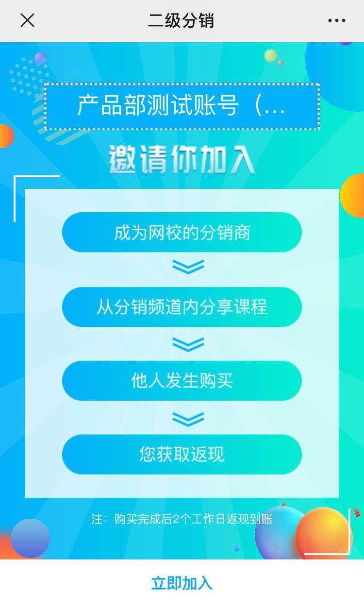 您的學(xué)員即可在網(wǎng)校課堂、定制app、H5網(wǎng)校(微網(wǎng)校)內(nèi),個(gè)人中心,看到“二級(jí)分銷”??勺孕袥Q定是否一鍵加入。