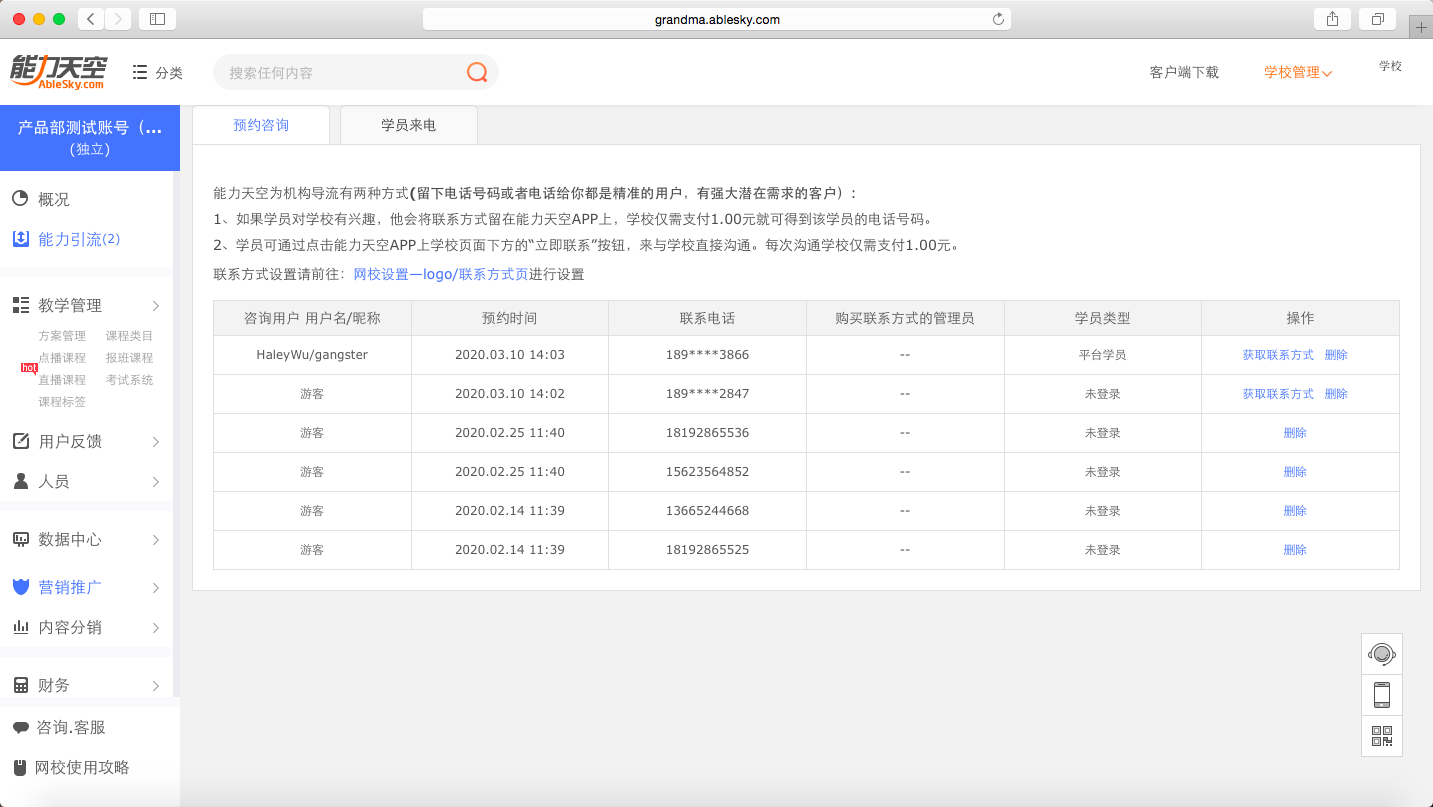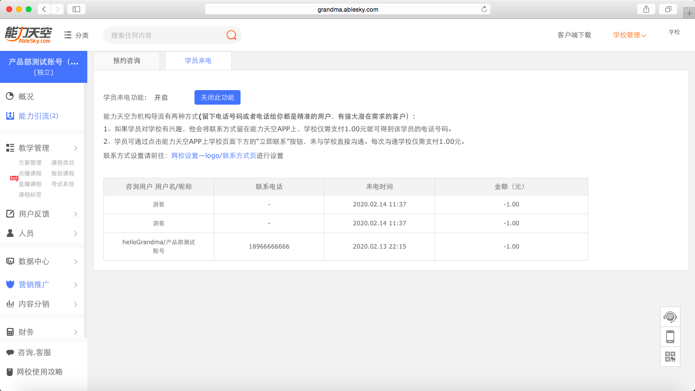 (2)直接撥打機(jī)構(gòu)聯(lián)系電話。(需在網(wǎng)校后臺(tái)-能力引流-學(xué)員來(lái)電,中開(kāi)啟此功能,才可生效)