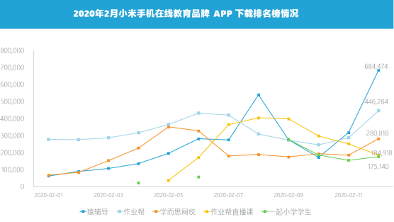 截至2020年2月12日,在手機型號為小米的APP下載量TOP100品牌中,共有16家在線教育品牌入圍,TOP5分別為猿輔導(dǎo)、作業(yè)幫、學(xué)而思網(wǎng)校、作業(yè)幫直播課、一起小學(xué)學(xué)生。