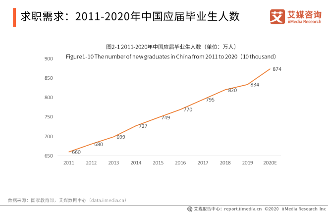 根據(jù)艾媒數(shù)據(jù)顯示,2019年應(yīng)屆畢業(yè)生共有834萬(wàn)人,2020年預(yù)計(jì)人數(shù)將達(dá)到874萬(wàn)人。從2011年至2019年,每年畢業(yè)人數(shù)在不斷增加,九年間增加了174萬(wàn)人,可想而知競(jìng)爭(zhēng)有多么的激烈。