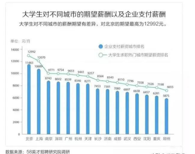 在如此大競(jìng)爭(zhēng)下,應(yīng)屆生對(duì)薪酬的期望并沒(méi)減少,據(jù)58同城《第十六屆中國(guó)大學(xué)生最佳雇主調(diào)研綜合報(bào)告》顯示:大學(xué)生期望薪資排名前三位的依次是北京、上海、南京,平均期望薪資分別為12992元/月、12070元/月、9771元/月。