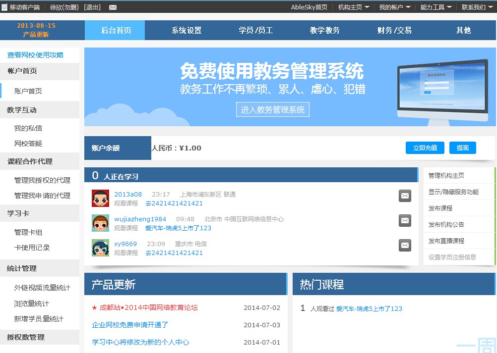 1、將網(wǎng)校動態(tài)、關鍵數(shù)據(jù)、答疑互動、統(tǒng)計等信息,以及課程推廣、學習卡、授權管理、