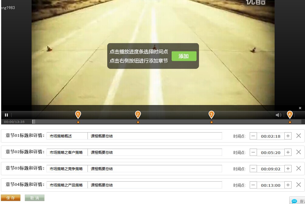 1、在課程播放進(jìn)度條上打時間點(diǎn),每個時間點(diǎn)(橙色的豎條)之間可以編輯分段名稱和注解,這樣學(xué)員對整個課件視頻每段的內(nèi)容就一目了然了。
