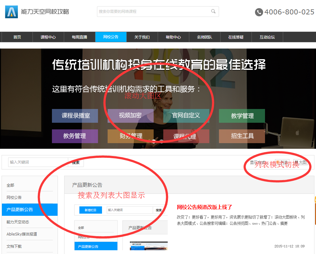 摘要:改變了:更好看了,更好用了,資訊展示更貼切了<br/>新增了:滾動(dòng)大圖板塊、列表大圖模式、公告搜索<br/>可編輯:公告預(yù)覽圖、seo、熱門公告、摘要