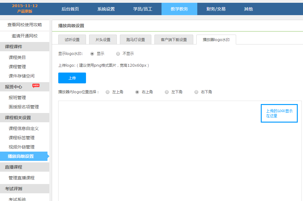 網(wǎng)頁(yè)播放器可以添加logo水印了,管理位置在:網(wǎng)校后臺(tái)>>教學(xué)教務(wù)>>課程相關(guān)設(shè)置>>播放高級(jí)設(shè)置